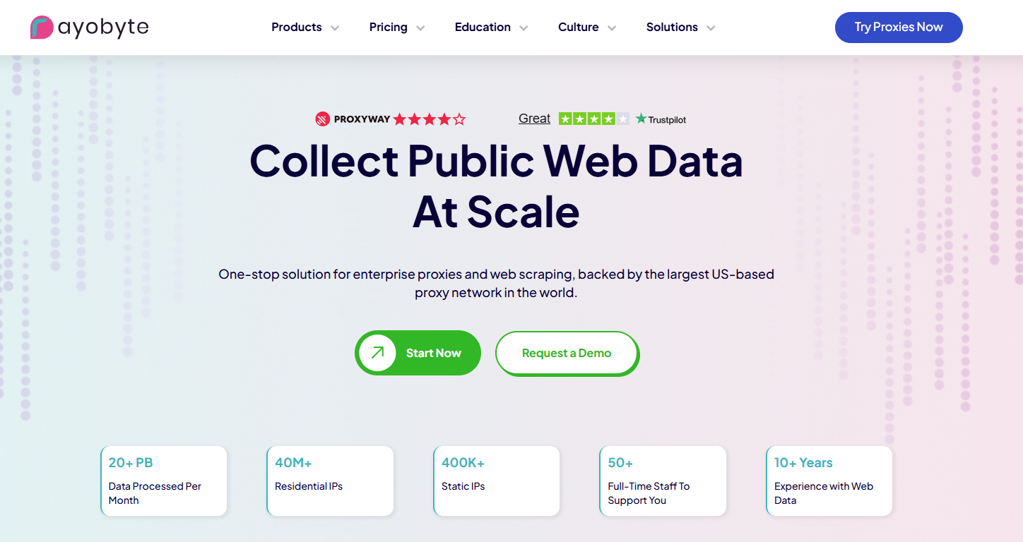 Rayobyte tiene una de las infraestructuras de servidores Proxy más pequeñas entre los mejores proveedores de Proxy. Las IP disponibles ni siquiera llegan al millón y solo hay disponibles algo más de 100 ciudades. La red abarca los cuatro tipos de Proxy y hay una prueba gratuita, aunque increíblemente limitada. La oferta se complementa con una herramienta para realizar Scraping web. G2 no tiene opiniones sobre esta empresa.