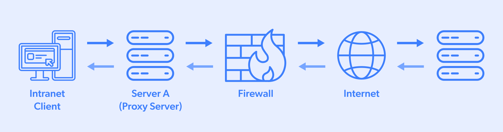 Un proxy inverso es una forma de estructurar el tráfico del proxy con el fin de añadir una capa adicional de protección a un conjunto interno de datos que se encuentra en una red privada/aislada. Para ello, transfiere las solicitudes primero a través de un cortafuegos y luego al primer servidor (A), que, sin que el solicitante lo sepa, las transfiere al segundo servidor (B), que es el que realmente posee la información de destino en cuestión. A continuación, el servidor A almacena (almacena en caché) los datos para que, cuando se produzcan solicitudes similares en el futuro, haya menos tráfico de red.