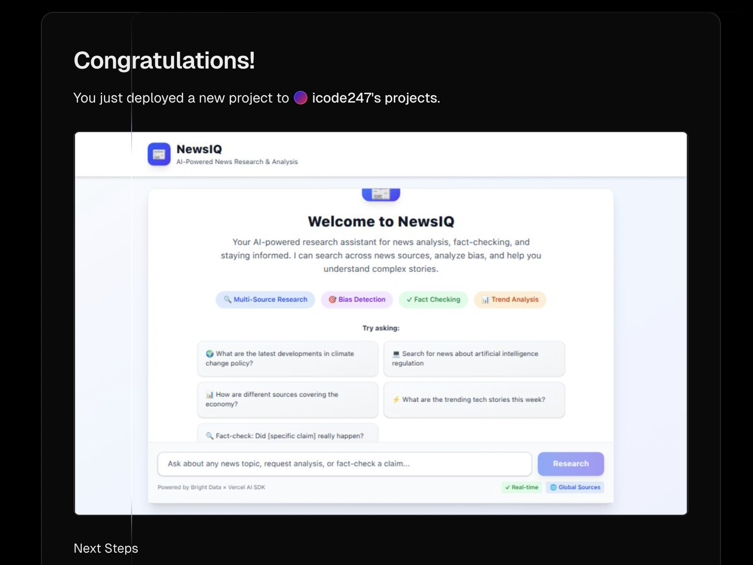 Construiremos NewsIQ, un completo asistente de investigación de noticias con IA que utilizará Bright Data y Vercel IA SDK. Crearemos una solución para procesar noticias de cualquier fuente y proporcionar un análisis inteligente a través de una interfaz conversacional.