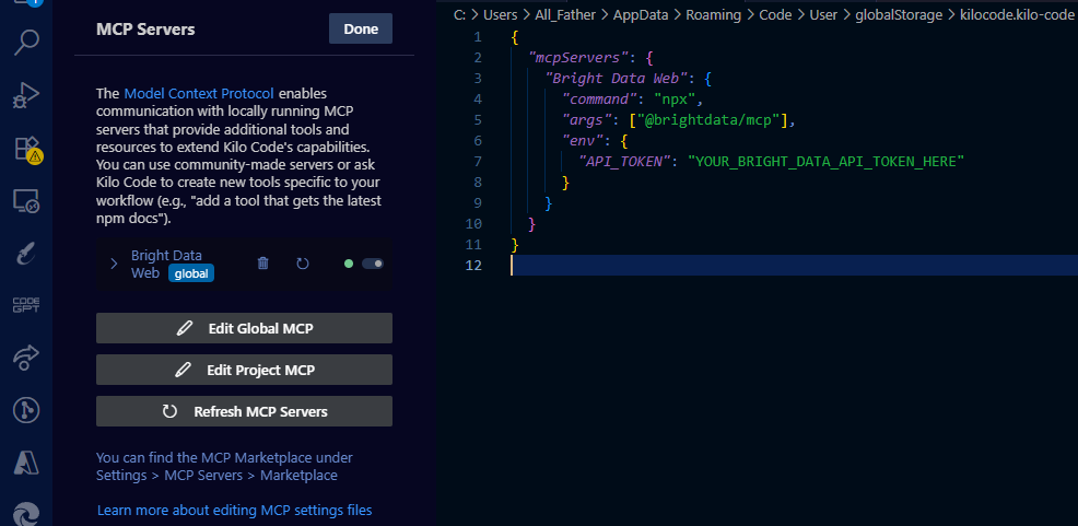 Cómo conectar Kilo Code al MCP Web de Bright Data en Visual Studio Code