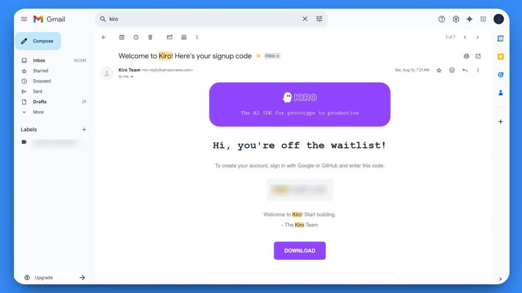 Antes de instalar Kiro, debe inscribirse en la lista de espera en kiro.dev y recibir una confirmación de acceso. Una vez que tengas acceso, sigue la guía oficial de instalación.
