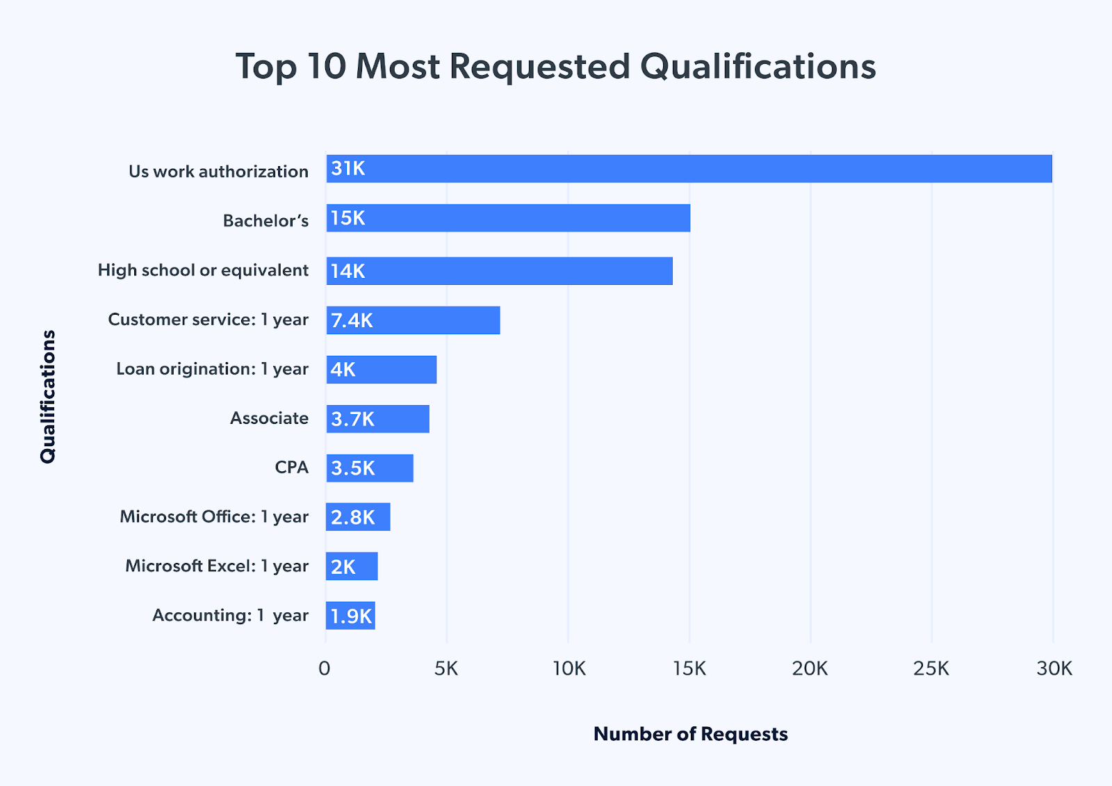 - La autorización para trabajar en EE. UU. encabeza las cualificaciones financieras con 30 966 solicitudes de los empleadores, mientras que las titulaciones universitarias ocupan el segundo lugar con 14 570 solicitudes.