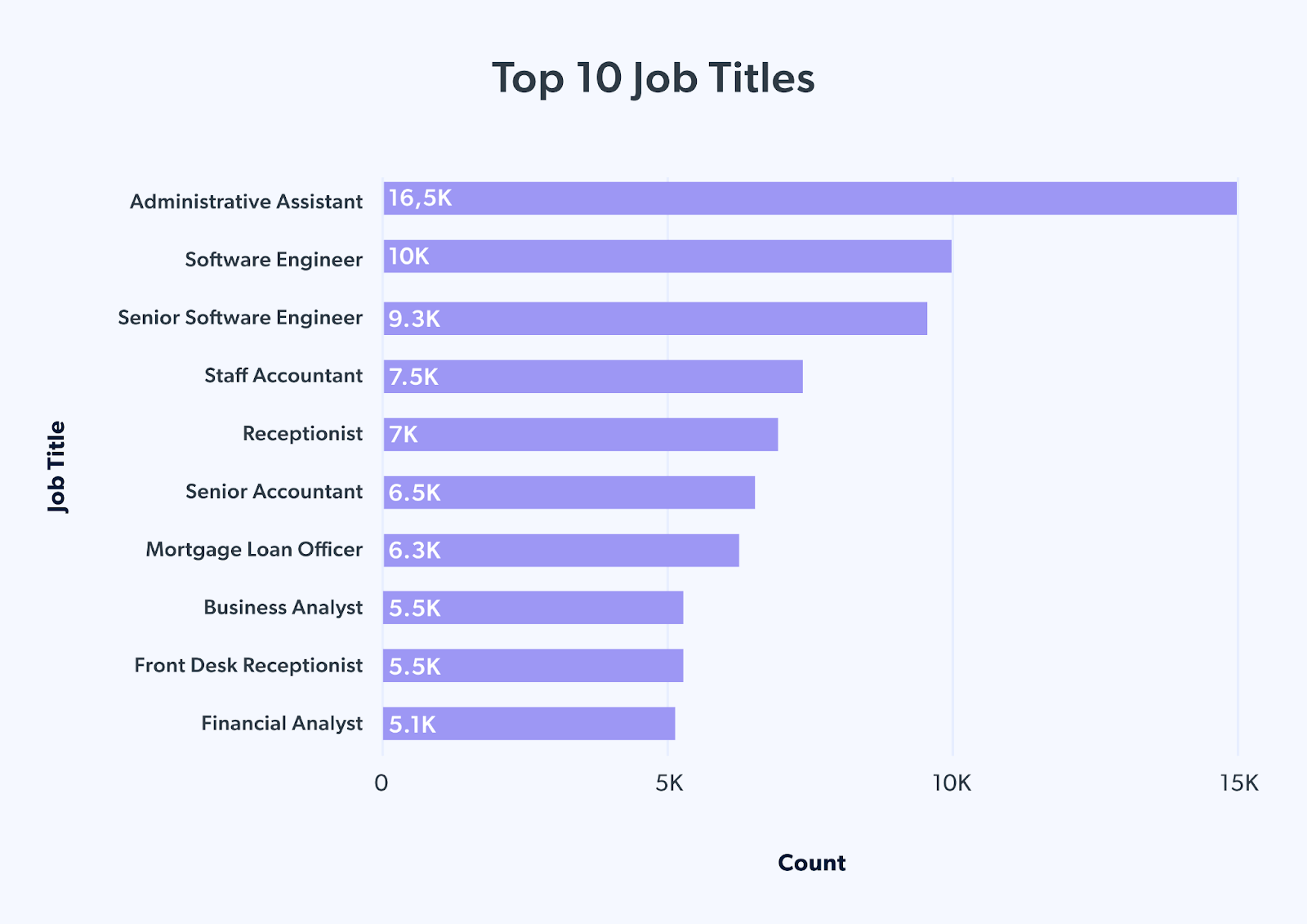 - Los asistentes administrativos dominan los puestos del sector financiero con 16 518 entradas (2,44 %), seguidos por los ingenieros de software con 10 051 entradas (1,48 %).