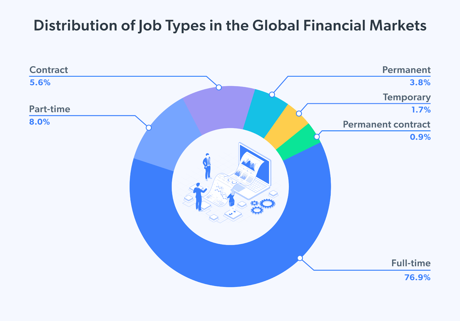 - Los solicitantes de empleo y los profesionales de las finanzas pueden utilizar esta información para planificar su trayectoria profesional. Comprender los tipos de puestos disponibles en un sector permite gestionar las expectativas en cuanto al equilibrio entre la vida laboral y personal y los estilos de vida futuros. Por ejemplo, quienes buscan trabajo temporal a corto plazo en diferentes instituciones financieras pueden necesitar ayuda para encontrar este tipo de puestos, ya que solo representan el 1,7 % de los puestos anunciados.