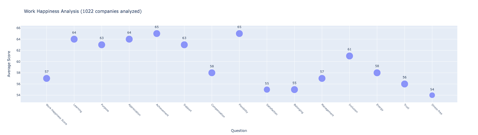 - La remuneración (58), la energía (58), la gestión (57) y la pertenencia (55) obtienen puntuaciones medias, lo que brinda a los responsables de RR. HH. la oportunidad de identificar áreas en las que mejorar la moral de los empleados y su satisfacción general.