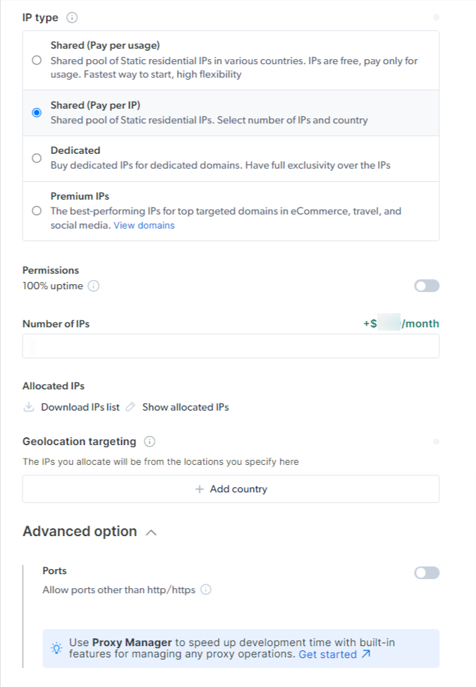 | Enfoque de configuración | Configuración de Proxy optimizada, con el widget Proxy Generator para generar rápidamente fragmentos de código para NodeJS, Python, cURL, etc. | Gestión optimizada de proxies en el panel de control, con posibilidad de exportación y generación de fragmentos de código a través de su widget interactivo. Estrategias de rotación complejas posibles a través de la aplicación de código abierto Proxy Manager. |