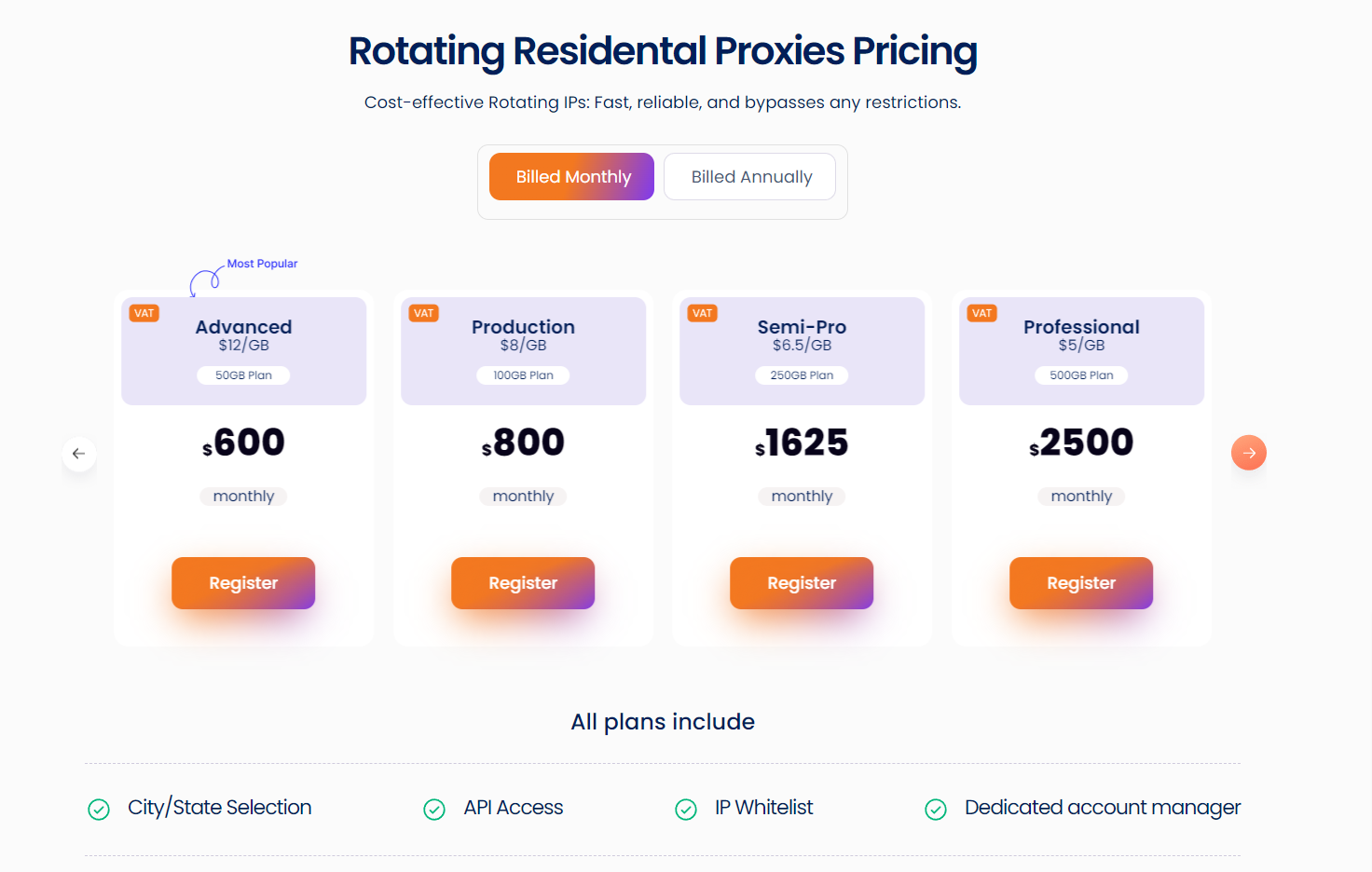 El servicio se vuelve más barato a medida que se amplía. Por ejemplo, en el caso de los Proxies residenciales rotativos, las tarifas bajan hasta 4 $/GB por 1 TB de datos. En cuanto a los Proxies residenciales estáticos, las tarifas bajan a 5 $/GB para el plan de 1 TB.