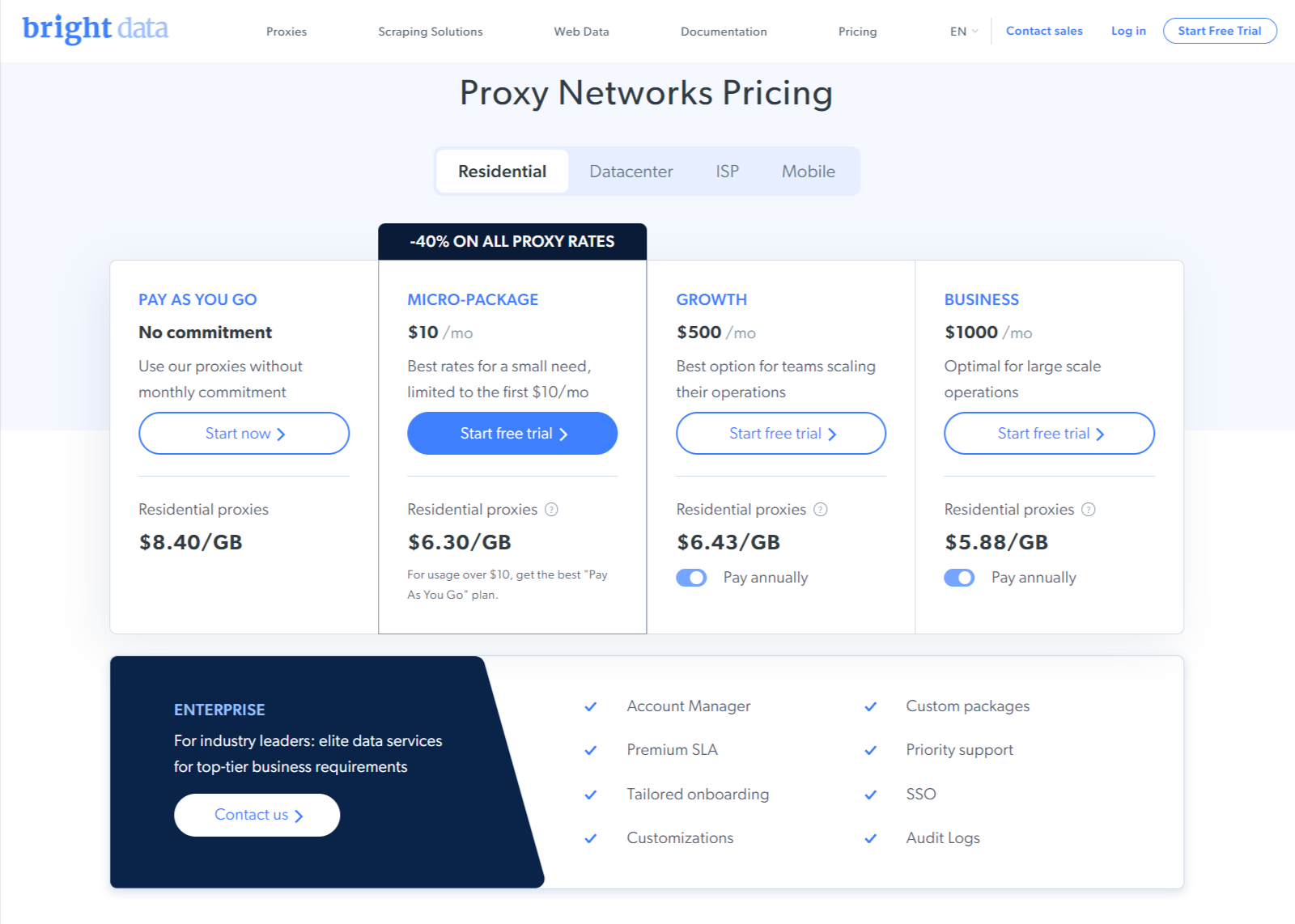 Bright Data, por otro lado, ofrece una gran flexibilidad. La mayoría de nuestros planes son de pago por uso. Solo tendrás que comprometerte si aumentas el volumen y optas por un plan más grande. La tarifa de Bright Data comienza con un plan de pago por uso sin compromiso, que cobra 8,4 $ por GB de tráfico. Además, hay un plan micro que cobra tan solo 10 $ al mes o 5,04 $/GB. Además, existe la opción de optar por nuestra prueba gratuita.