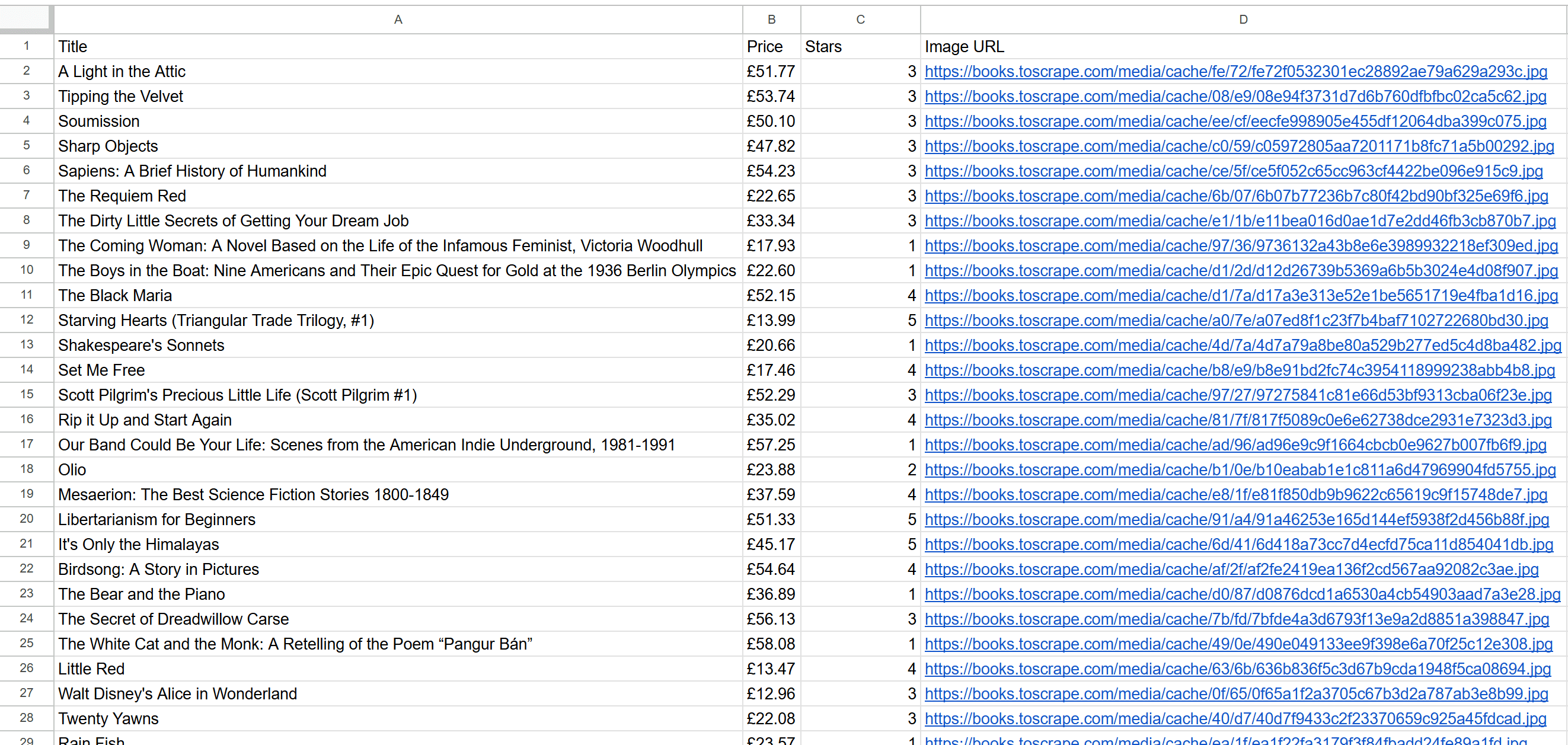 Observe la estructura else if utilizada para obtener la clasificación por estrellas basada en el atributo class de .star-rating. Además, vea cómo la URL relativa de la imagen se convierte en una URL absoluta utilizando strings.Replace().