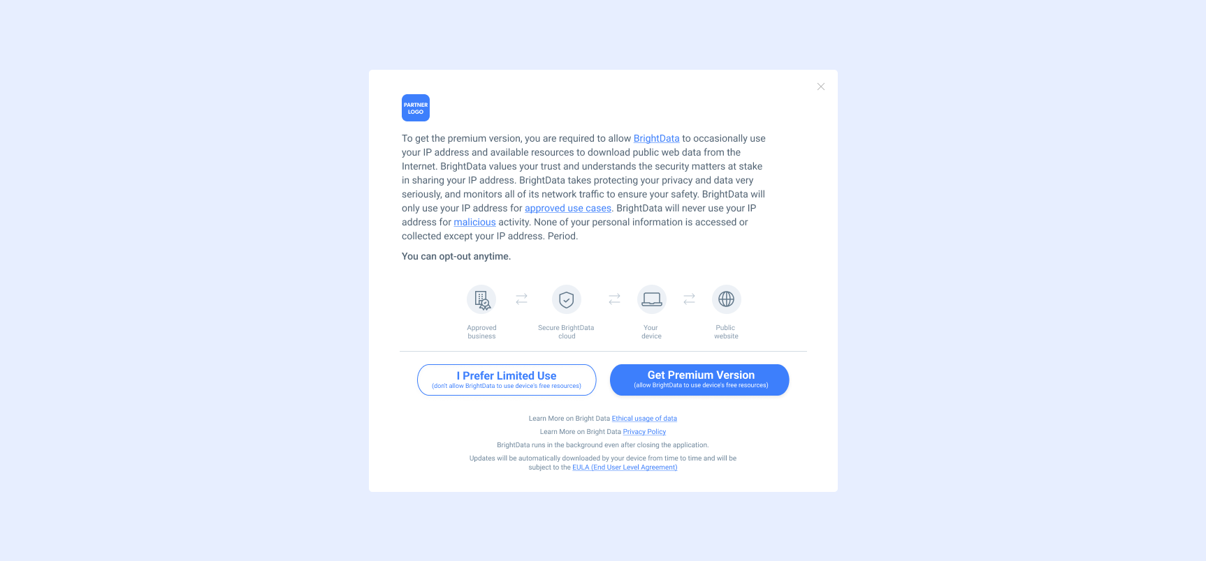 Todos los socios SDK de Bright Data, tanto los existentes como los nuevos, se benefician del programa AppEsteem. Ahora, todos los nuevos socios se incluyen en el programa. La participación es gratuita para el socio; la paga Bright Data.