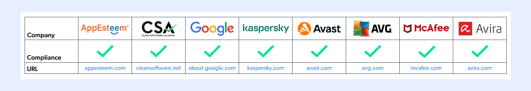 A continuación se muestra una muestra de las conclusiones de las principales empresas de certificación de software del sector en relación con el historial de seguridad y cumplimiento normativo de EarnApp para desarrolladores: