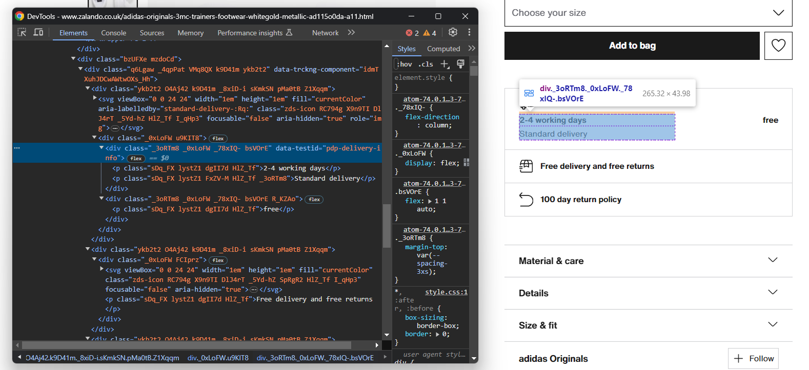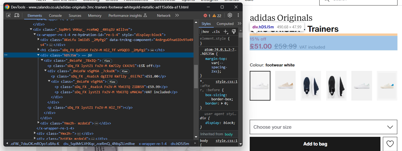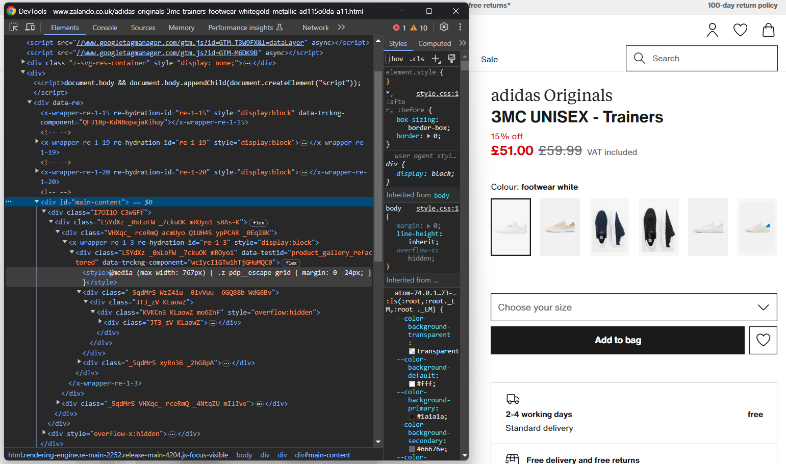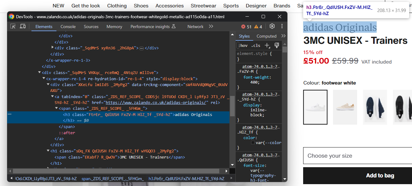 Abra su navegador en modo incógnito y visite la página del producto Zalando elegido. Haga clic con el botón derecho del ratón y seleccione la opción «Inspeccionar» para abrir las herramientas de desarrollo de su navegador: