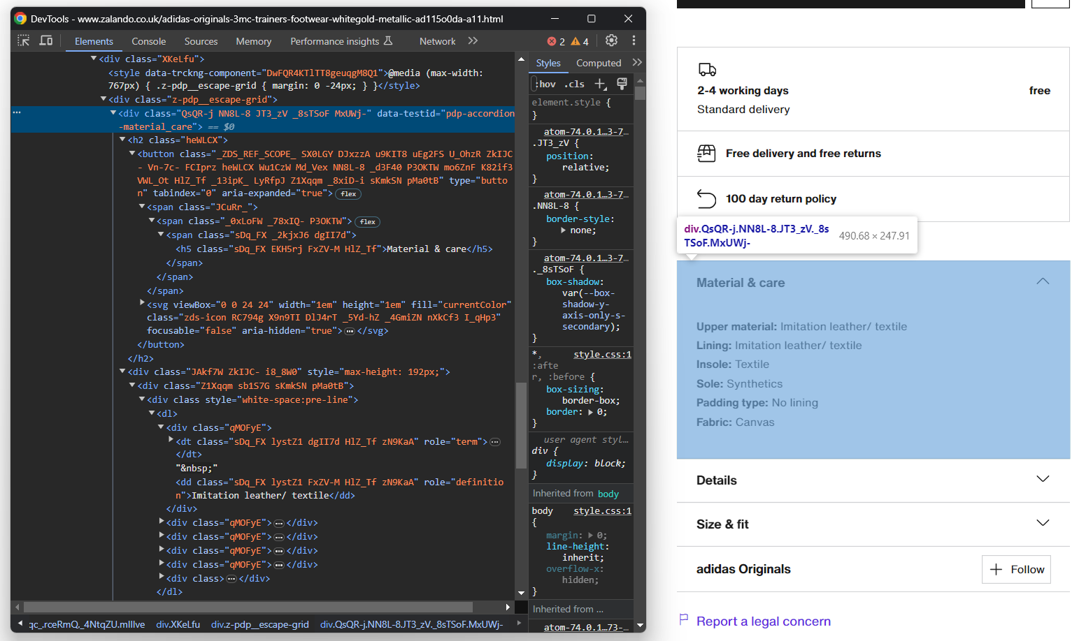 Para saber cuál de las muchas herramientas de scraping disponibles es la mejor para hacer scraping en Zalando, ábrela en tu navegador. Inspecciona el DOM y compáralo con el código fuente sin procesar. Notarás que la estructura del DOM es ligeramente diferente del documento HTML producido por el servidor. Esto significa que el sitio se basa en JavaScript para la renderización. Para hacer scraping en un sitio de contenido dinámico, necesitas una herramienta que pueda ejecutar JavaScript, como Selenium.