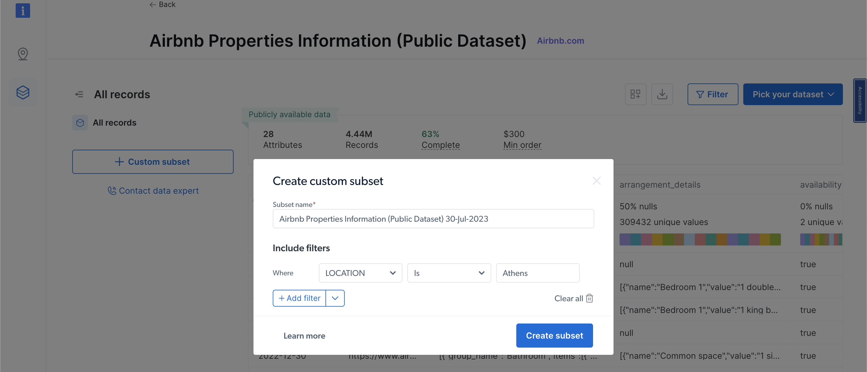 Para ver los conjuntos de datos, haz clic en «Datos web» en el menú de navegación de la izquierda, selecciona «Mercado de conjuntos de datos » y busca «Airbnb». Haz clic en «Ver conjunto de datos». Desde esta página, puedes aplicar filtros y comprar los datos que desees. El pago se basa en el número de registros que desees: