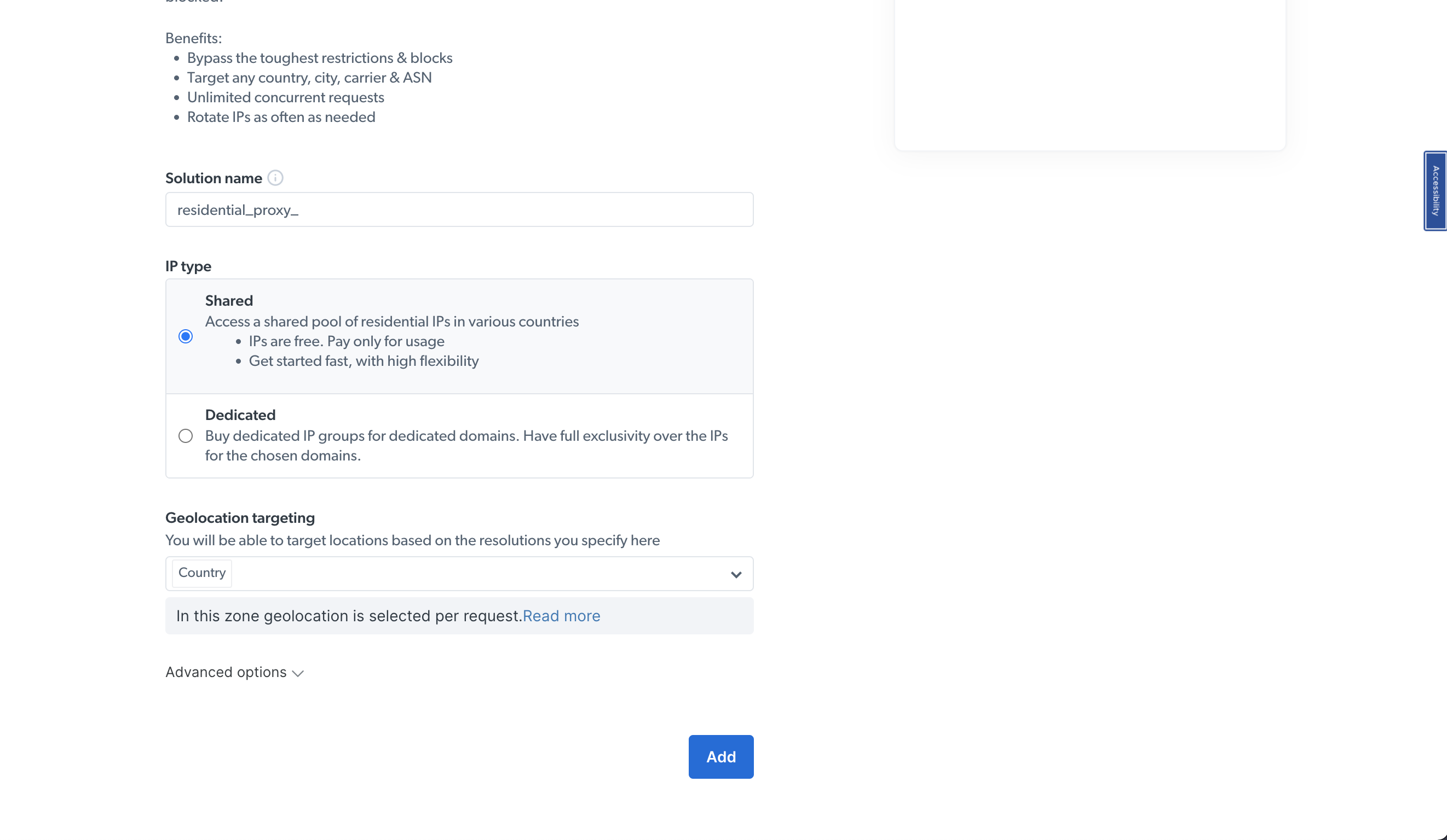 Asigne un nombre a su Proxy (por ejemplo, proxy_residencial1) y utilice la opción «Compartido» en «Tipo de IP». A continuación, haga clic en «Añadir»: