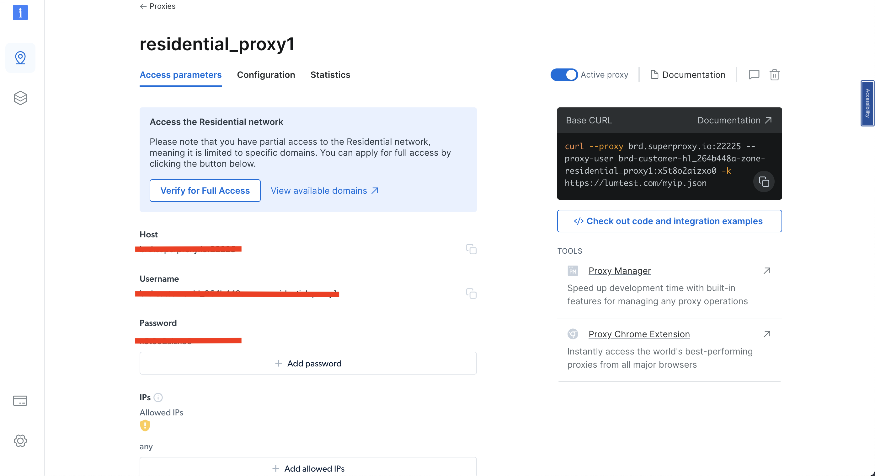 Una vez que haya creado su Proxy residencial, tome nota de los parámetros de acceso, ya que necesitará utilizar estos datos en su código: