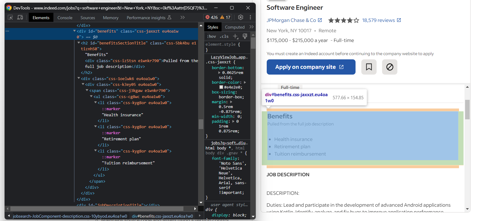 Es información útil que hay que tener en cuenta para los trabajos de Scraping web de Indeed. Interactúa con la página para estudiar cómo reacciona y qué datos muestra. Te darás cuenta de que las diferentes ofertas de empleo tienen diferentes atributos de información.