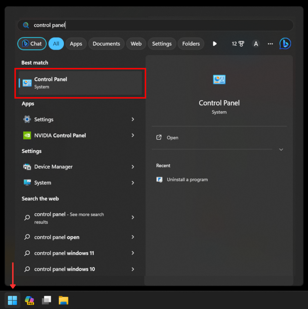 Paso n.º 1: haz clic en el botón Inicio de Windows, escribe «panel de control» y selecciona la opción «Panel de control»: