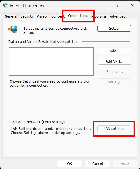 Paso 4: Vaya a la pestaña «Conexiones» y haga clic en el botón «Configuración de LAN»: