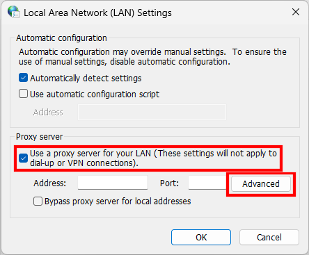 Nota: Para desactivar el servidor Proxy en Windows, simplemente desactive las opciones de Proxy.