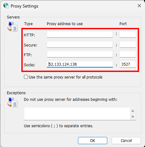 Nota 1: De forma predeterminada, Windows considerará tu Proxy como un Proxy HTTP. Por lo tanto, no es necesario que introduzcas manualmente el protocolo «HTTP».