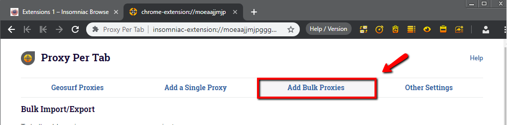 - En la extensión Insomniac Proxy per tab, seleccione Manage Proxy list(Gestionar lista de proxies) y seleccione Add bulk proxies (Añadir proxies masivos).