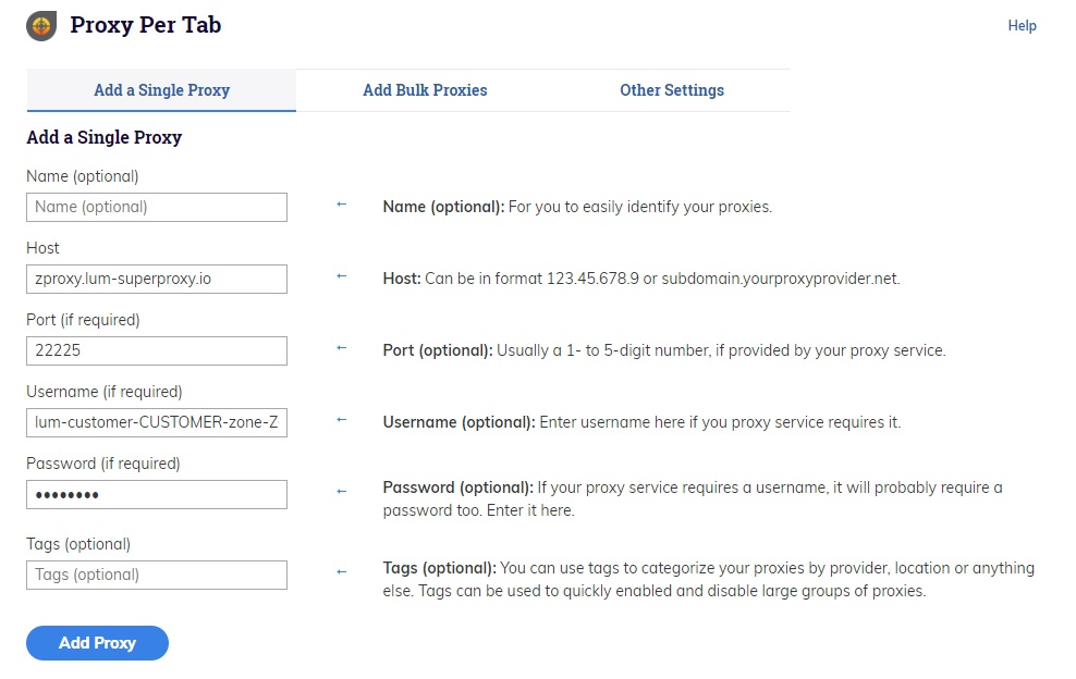 - En la extensión, haga clic en la pestaña Añadir un único Proxy