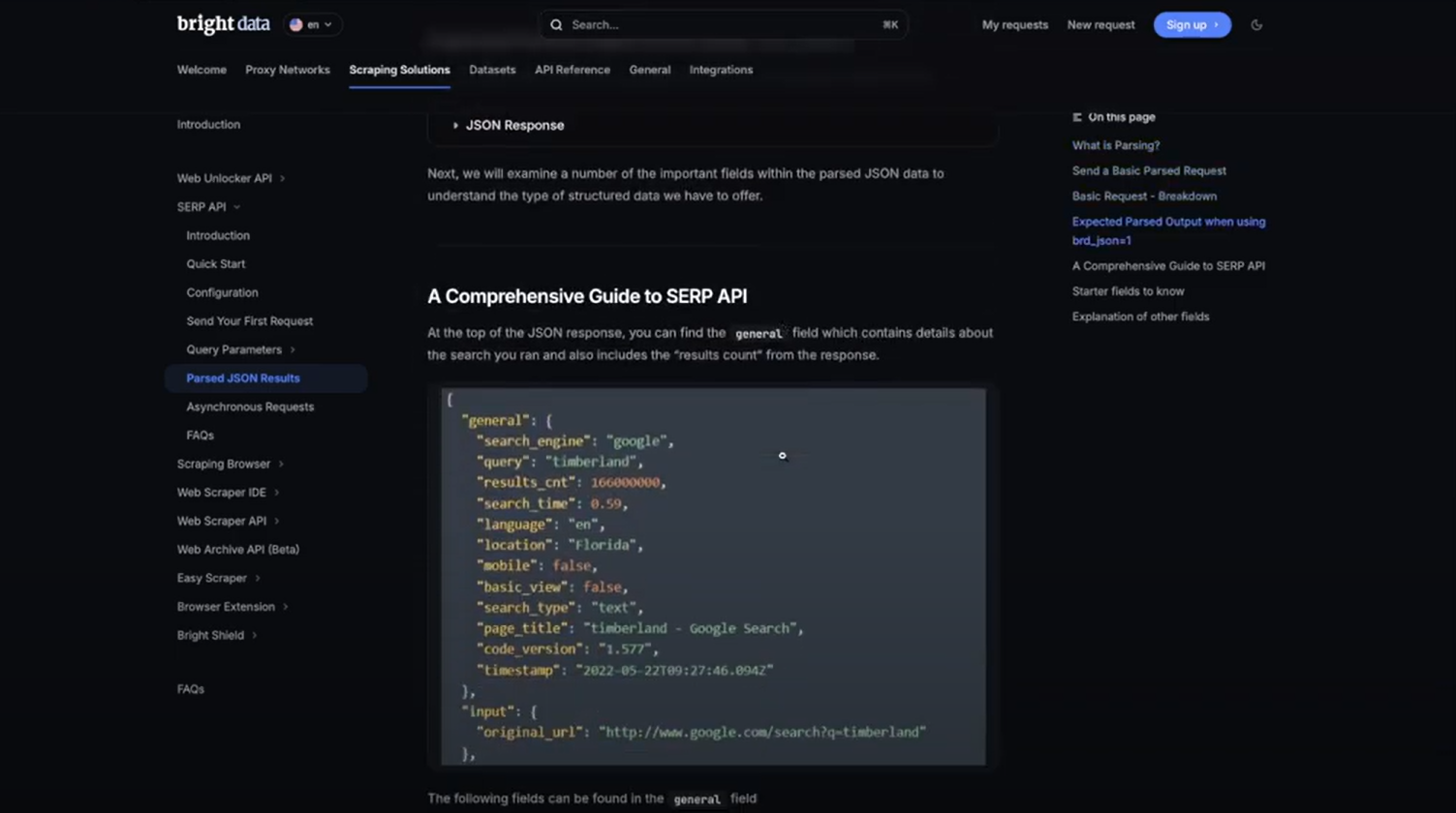 Para supervisar el rendimiento de su marca en motores de búsqueda como Google, utilizaremos la API SERP de Bright Data . Esta herramienta facilita el rastreo de los resultados de los motores de búsqueda y la extracción de datos como clasificaciones, enlaces y descripciones.